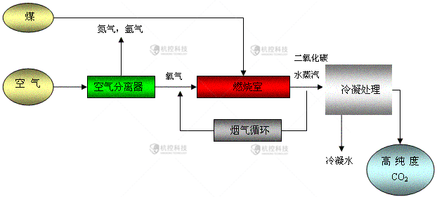 富氧燃燒技術主要由3 個基本步驟組成:空氣分離、O2/ CO2 燃燒和煙氣壓縮與脫水。
