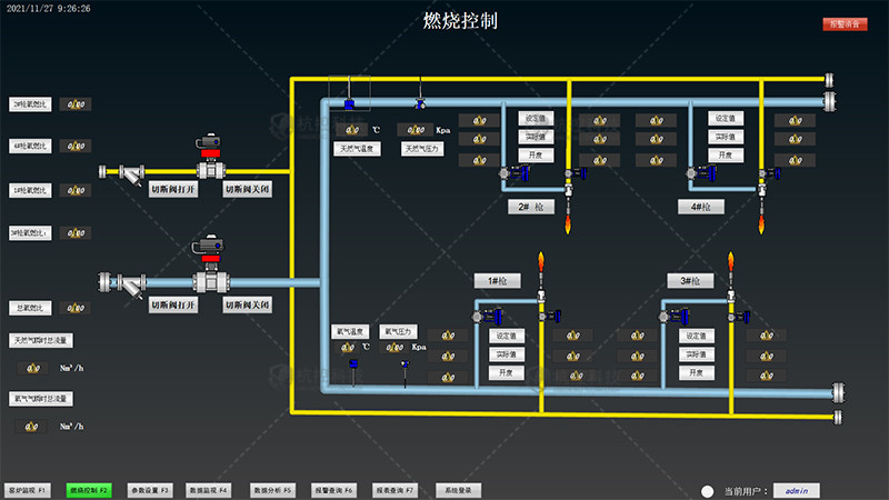 根據工藝過程的特性及控制要求,我公司推出的DCS控制系統,主要控制內容包括熔化池及工作池的溫度、氧氣流量、天然氣流量、玻璃液位、窯爐壓力的自動調節、連續加料的自動控制以及通道溫度的自動調節、燃燒系統流量的自動控制等。我司在燃燒領域的控制技術越來越完善,使得整個項目的運作開發、現場調試安裝和投運后的維護都變得相對簡單,充分體現了分敬控制、集中管理的工作模式。